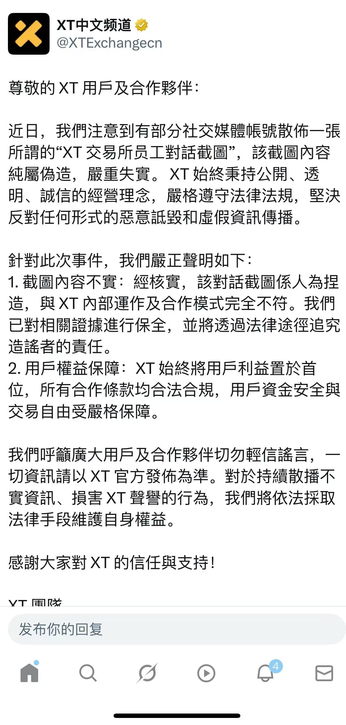 之后,XT交易所对此进行了辟谣