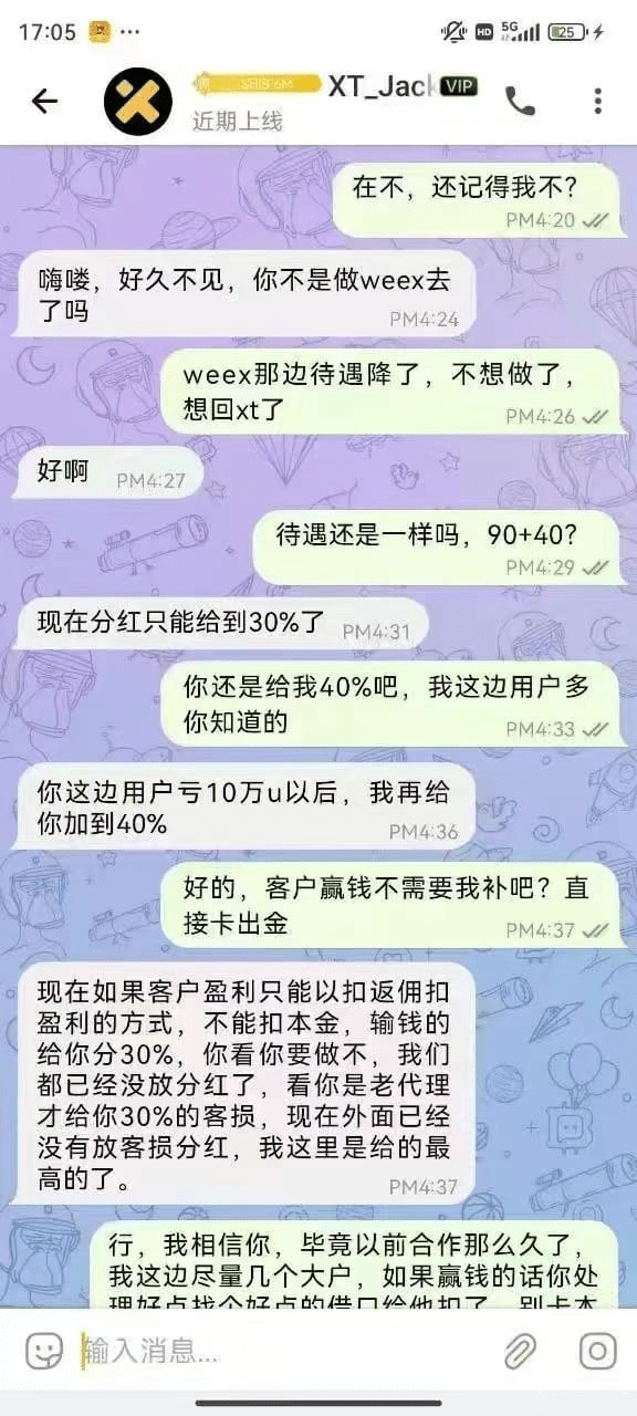 最近社交媒体爆出了一段聊天记录,XT交易所在任员工(A)和某个前员工(B)(之前去过Weex)之间的沟通,里面涉及到了代理分成和吃客损(即客户亏损平台获利)的问题