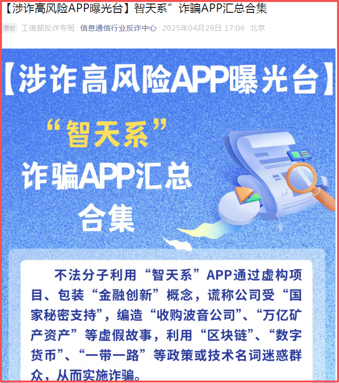 4月底,工信部反诈专班曝光了20个智天相关的骗局。