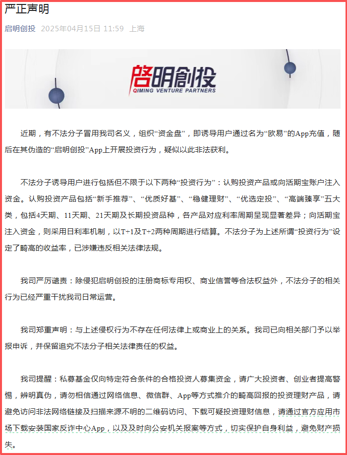 14、套牌 “启明创投 QMVP” APP:冒用正规 “启明创投” 名义,诱导用户通过 “欧易” APP 充值后在伪造 APP 上投资,设 “新手推荐”“优质好基” 等 5 类产品(周期 4 天 - 长期)及 “活期宝” 日利率产品(T+1/T+2 结算);正规启明创投无官方 APP,已发声明辟谣,提醒投资者勿信网络高回报理财。