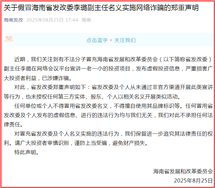 16、虚构 “一老一小” 项目:冒充 “国家公职人员”,打着 “国家名义” 宣称实名注册并缴纳 29 元激活养老账户、100 元激活公积金账户,可领取对应国家补贴,还推出 “一老一小养老基金” 虚假理财项目;有人冒用海南发改委副主任李璐名义宣讲,海南发改委已声明系诈骗,APP 未备案且带病毒。